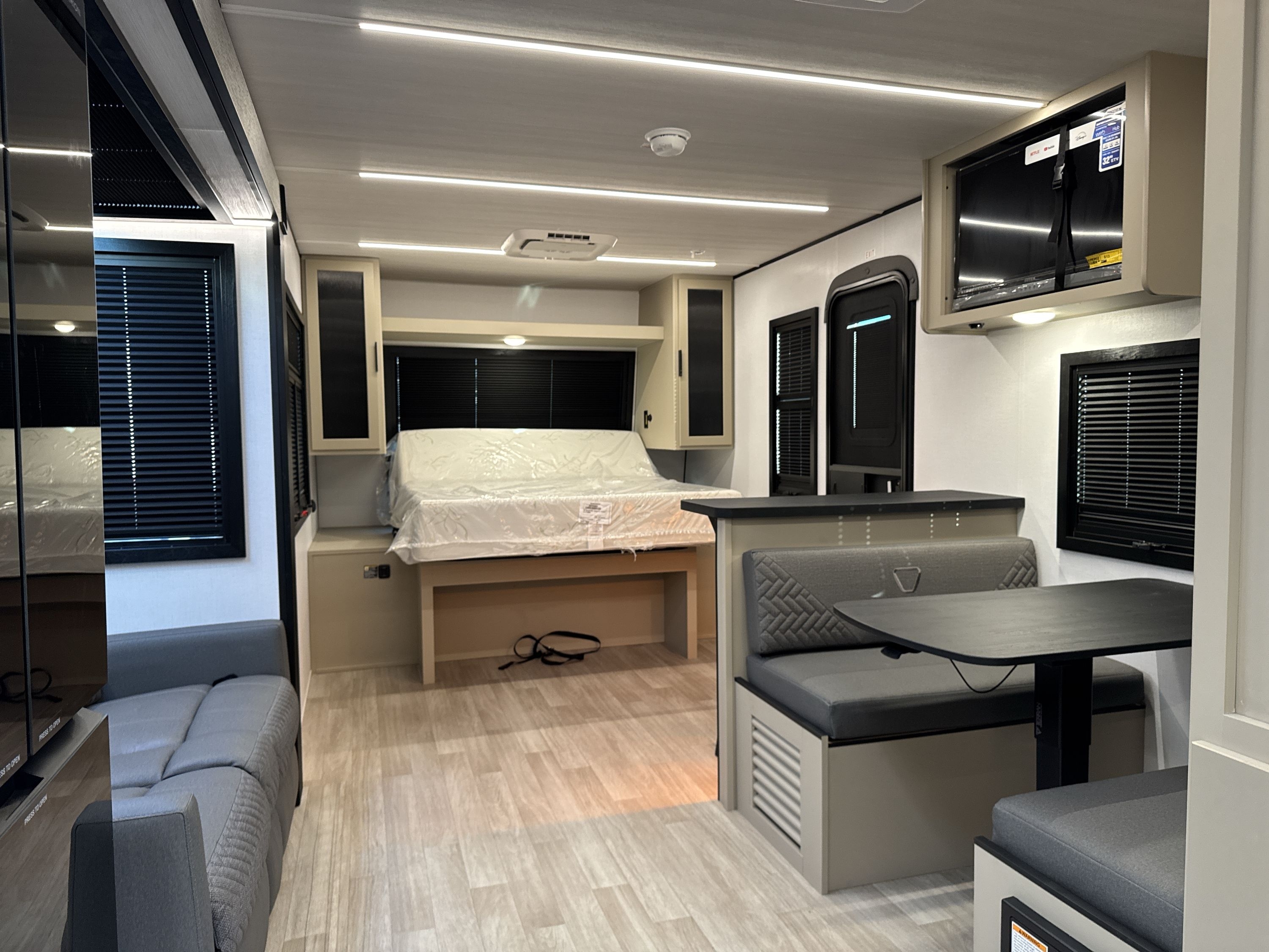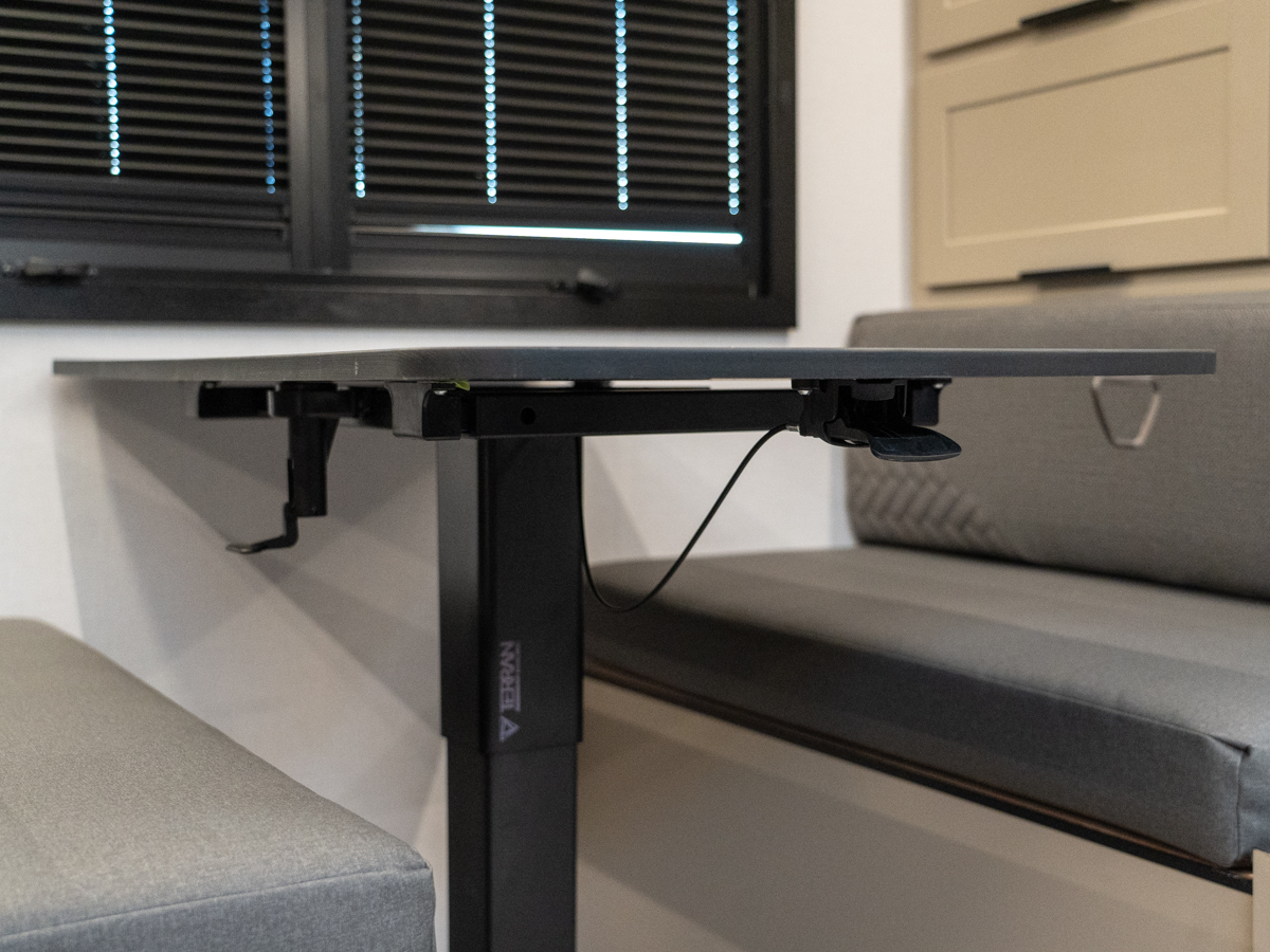Eliminating the need for separate table legs, the Keystone Walkabout 22MAX has a ‘Pop-n-Drop’ dining table designed to convert into a bed with a pop of a lever and a push down.